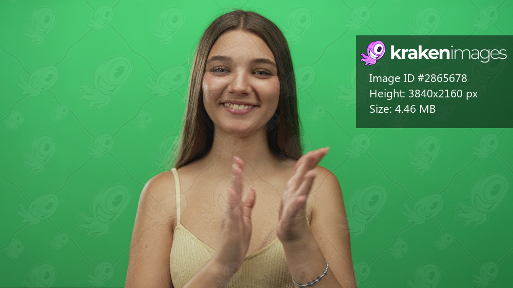 Teenage girl with long brown hair smiling and clapping hands in green studio setting; happiness celebration approval joy.