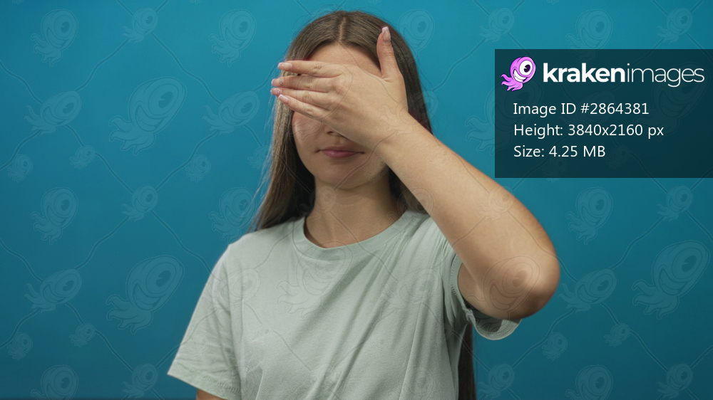 Teenage girl with long brown hair wearing a light green shirt covers her eyes with her hand in a studio environment; vulnerability.