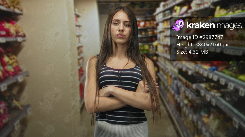 Teenage girl with long hair, arms crossed and gaze averted in a supermarket aisle inside a building, handheld products on shelves visible; defiance waiting. - Kraken Images