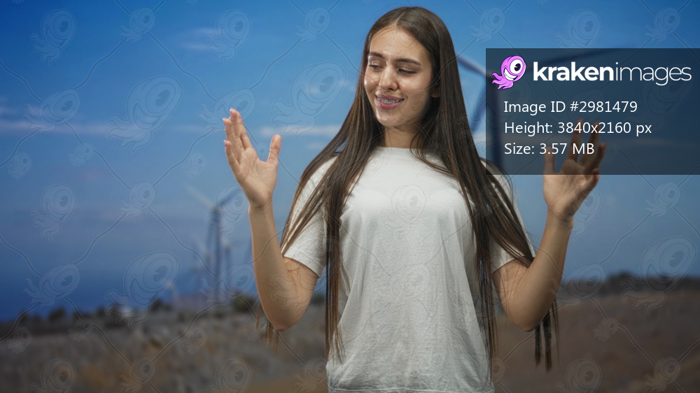 Teenage girl with long hair and braces raises both hands palms visible wearing white t shirt by wind turbines in street; quiet joy.