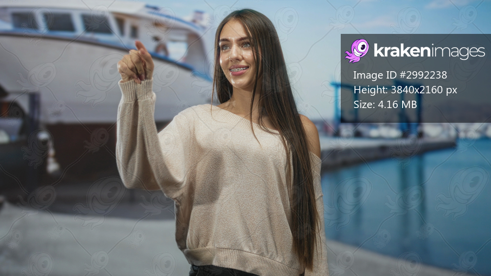 Teenage girl with long hair and braces waves right hand showing raised palm beside a yacht at a marina dock; friendly greeting optimism.