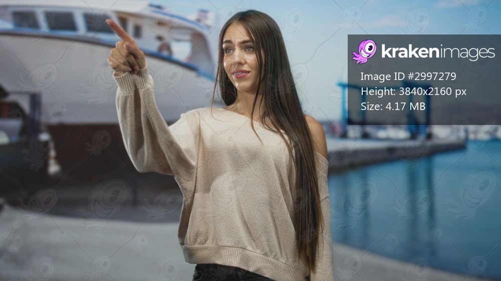 Teenage girl with long hair and braces waves right hand showing raised palm beside a yacht at a marina dock; friendly greeting optimism.