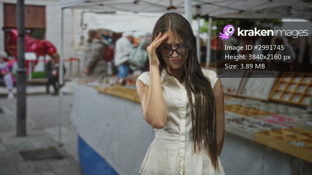 Teenage girl with long hair and glasses pressing her forehead with one hand at a street market stall displaying jewelry trays and tents; frustration.