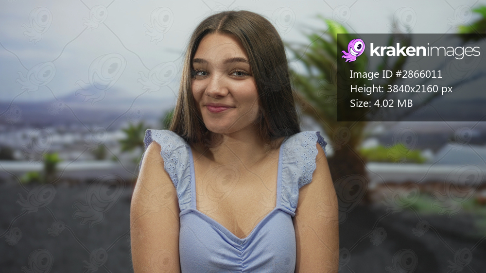 Teenage girl with long hair smiles showing bare shoulders by building under soft sunlight; serenity.