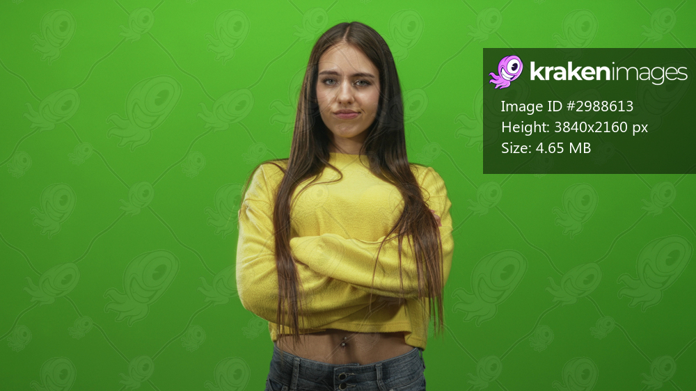 Teenage girl with navel piercing and long hair standing with arms crossed and pouting in a green studio, wearing yellow sweater and jeans; defiance.