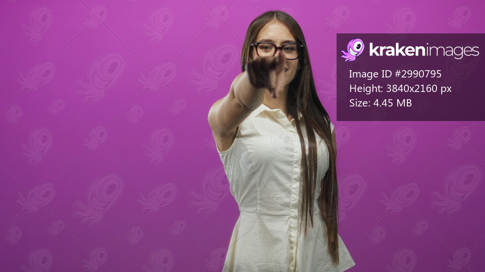 Teenage girl pointing finger at camera in studio wearing glasses and braces and a white sleeveless top, smiling broadly; playful.