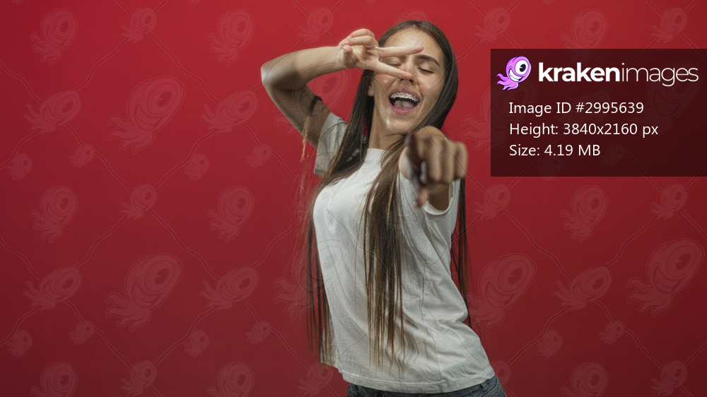 Teenage girl pointing finger at camera with peace sign by eye, braces visible against a solid red backdrop in studio; playful joy.