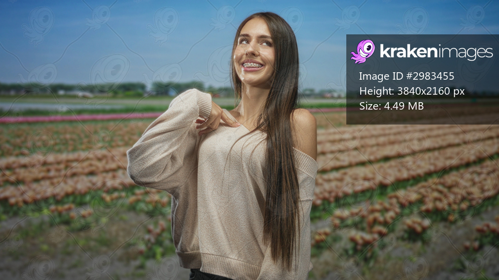 Teenage girl pointing finger to shoulder while smiling with braces, wearing off shoulder sweater and long hair in a tulip field under blue sky; confidence ease. - Kraken Images