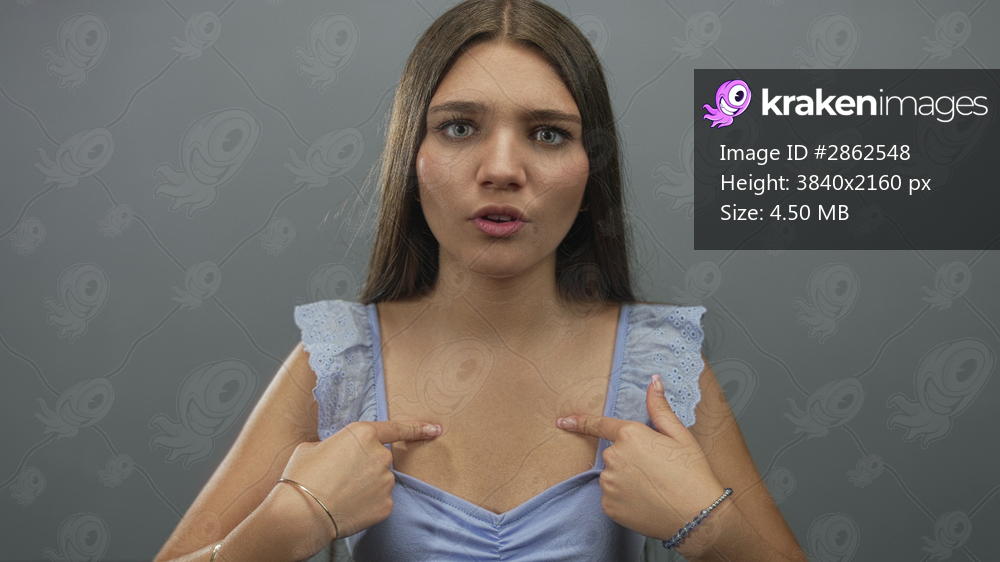 Teenage girl pointing fingers to chest against a smooth grey studio backdrop with direct eye contact; uncertainty.