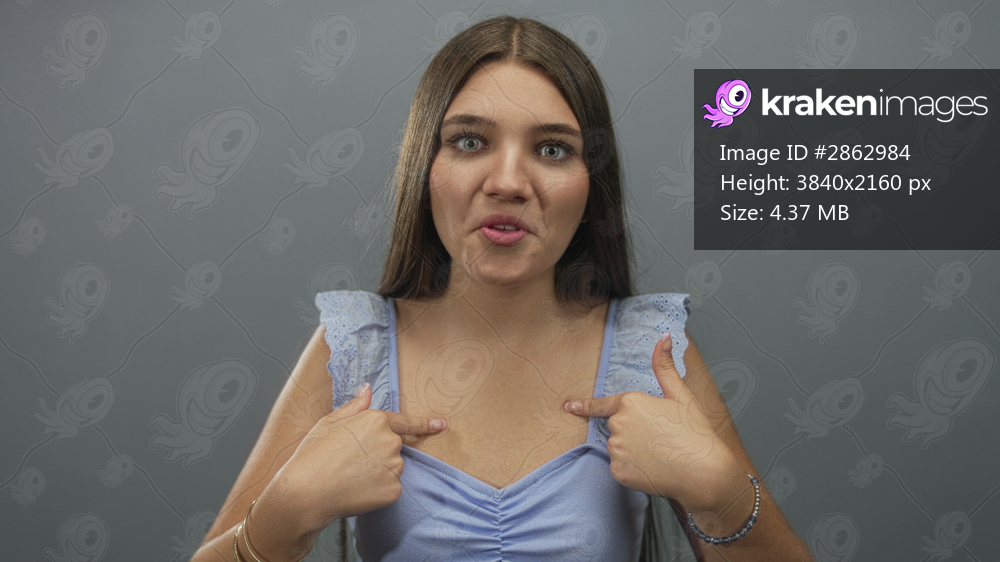 Teenage girl pointing fingers to chest against a smooth grey studio backdrop with direct eye contact; uncertainty.