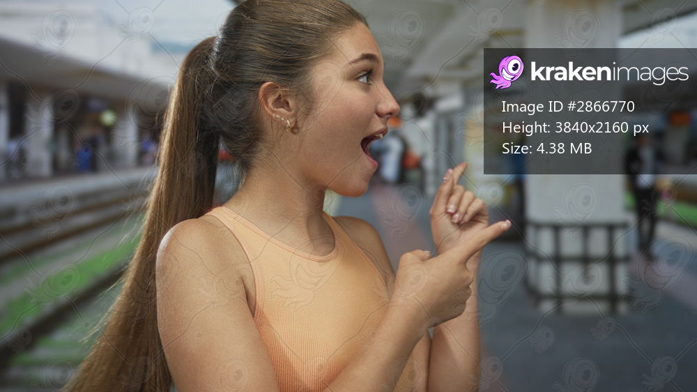 Teenage girl points finger at train car door in railway station building with wide open mouth; anticipation excitement.