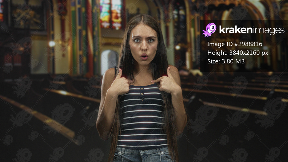 Teenage girl points fingers to chest inside ornate church building, pouting and asking who is responsible; confusion doubt.