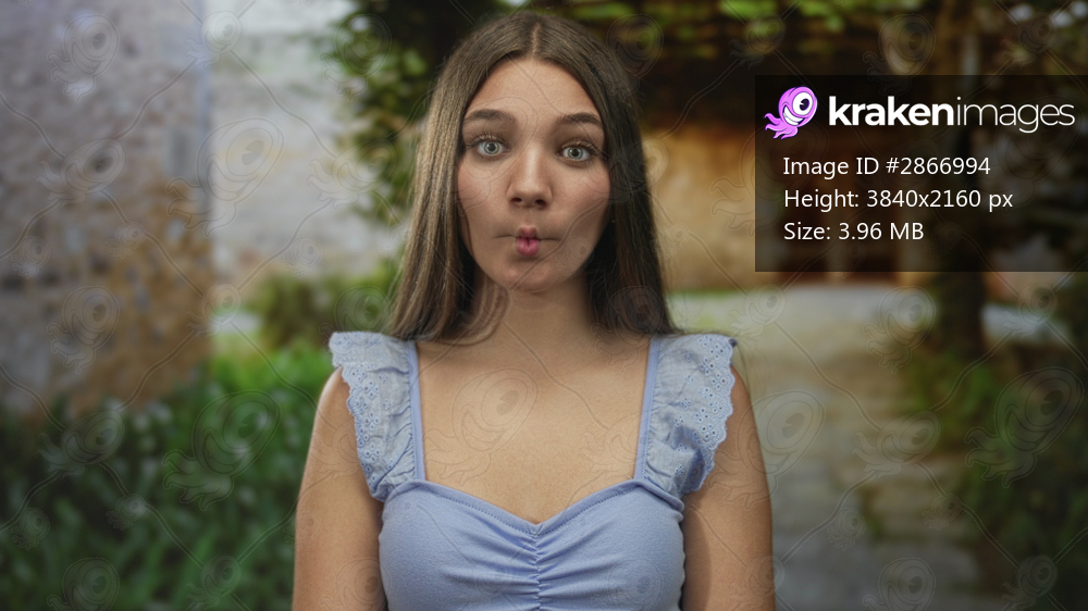 Teenage girl puckers lips and smiles in soft morning light at building entrance outdoors; carefree joy.