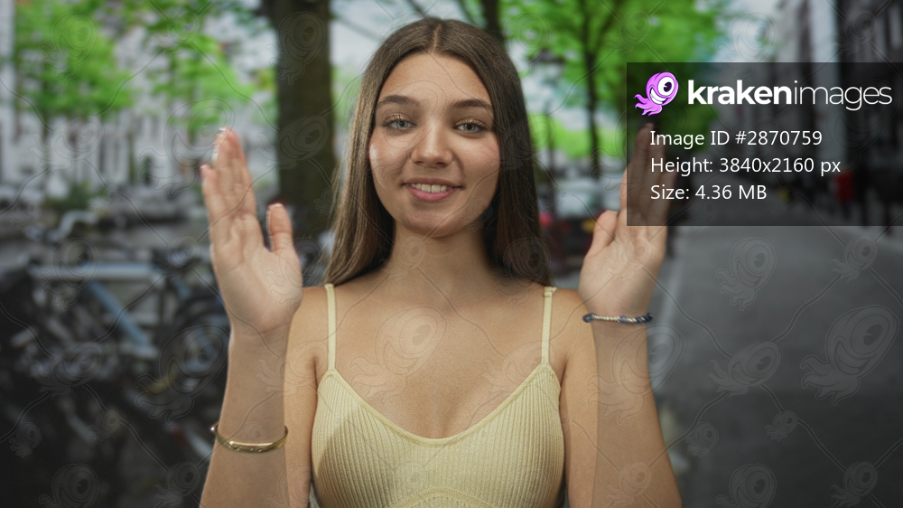 Teenage girl raises both palms beside her face in front of parked bicycles on a city street; confidence.