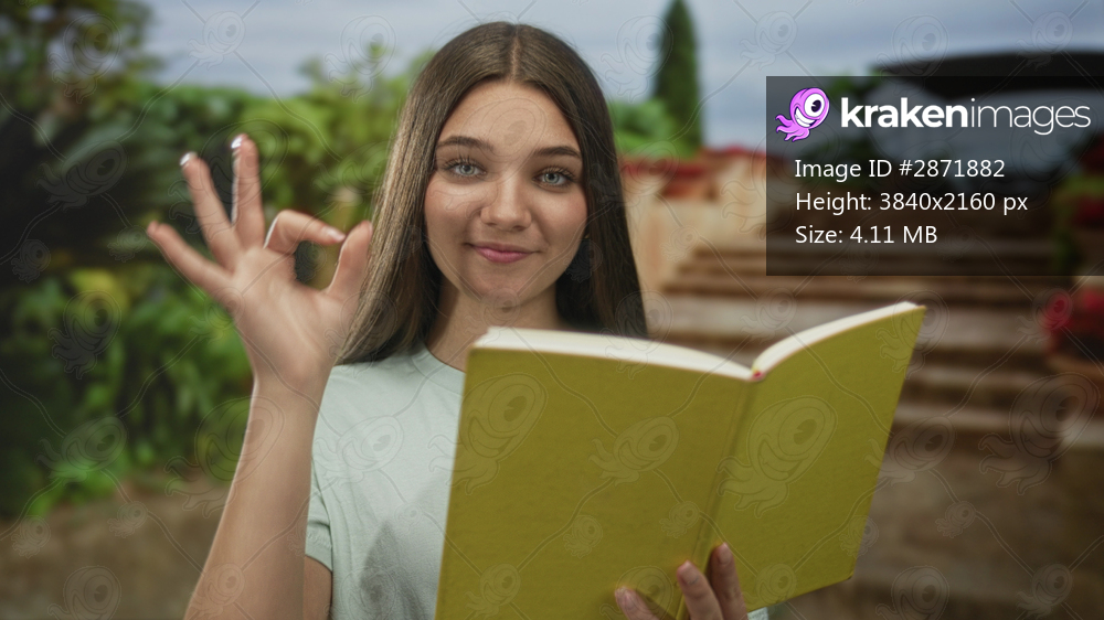 Teenage girl reading a green paperback book on stone steps in a park outdoors, holding the book; calm learning concentration.