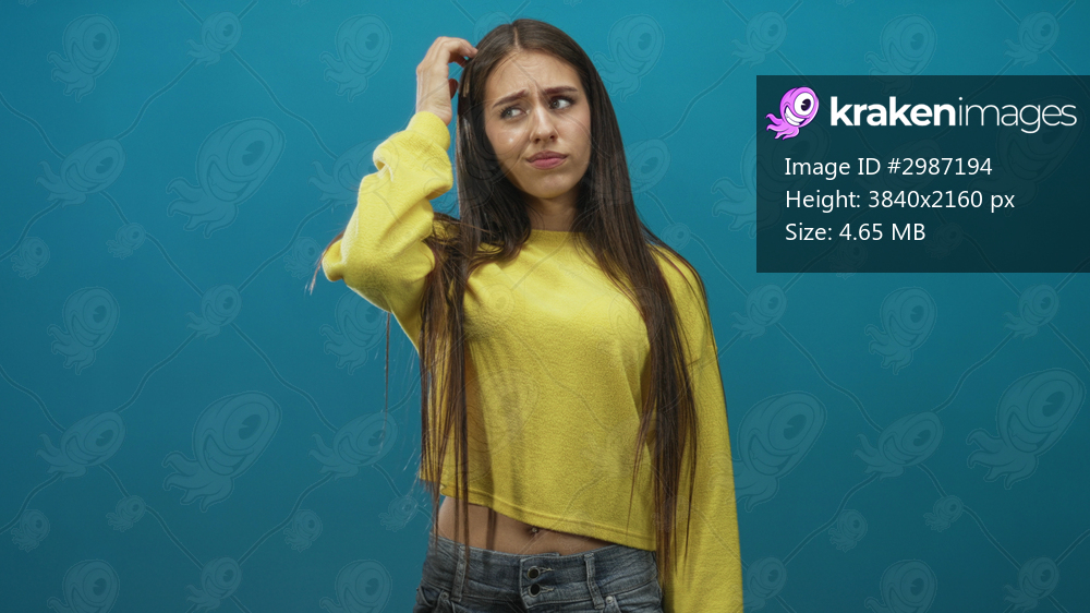 Teenage girl scratching head with hand, wearing yellow sweater and jeans in studio with teal backdrop; confusion uncertainty.
