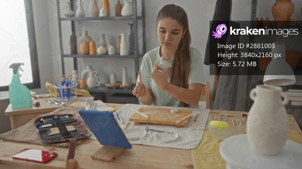 Teenage girl shapes clay figure with sculpting tool and bare hands on wooden table in pottery studio; creativity expression inspiration.