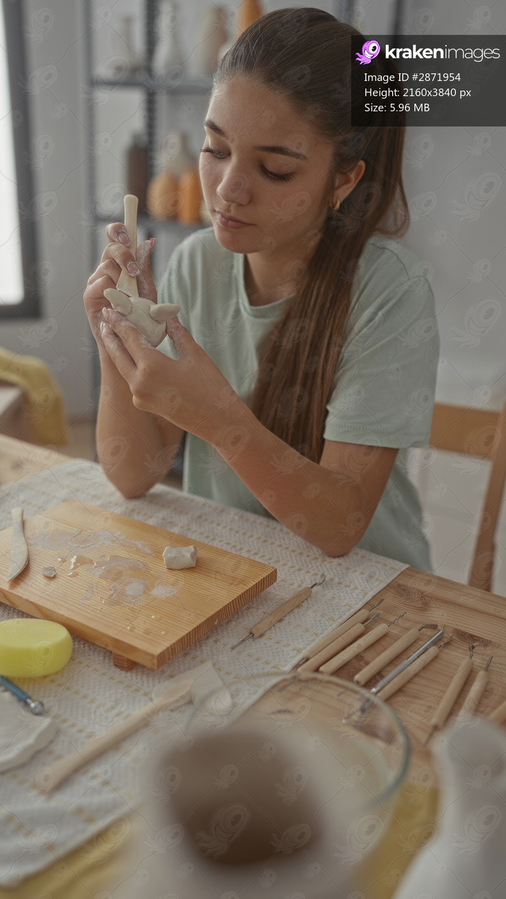 Teenage girl shapes smooth white clay vessel with carving tool and visible hands on wooden table in bright pottery studio; calm focus.