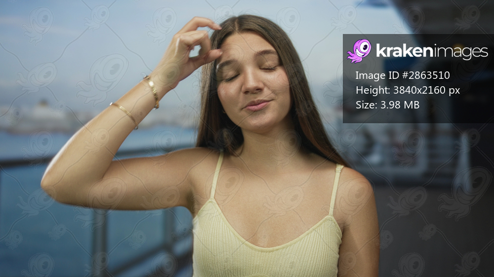 Teenage girl smiles with bare shoulders on boat deck by building and leans on railing against ocean view; serenity wanderlust joy adventure.