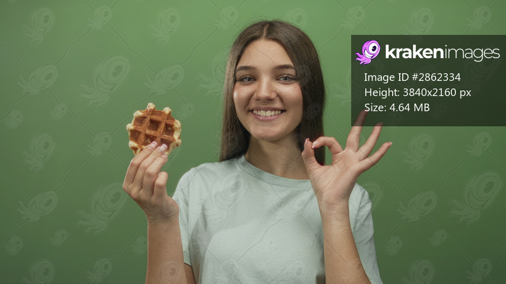 Teenage girl smiles broadly while holding fresh waffle and makes ok sign in studio; delight approval.