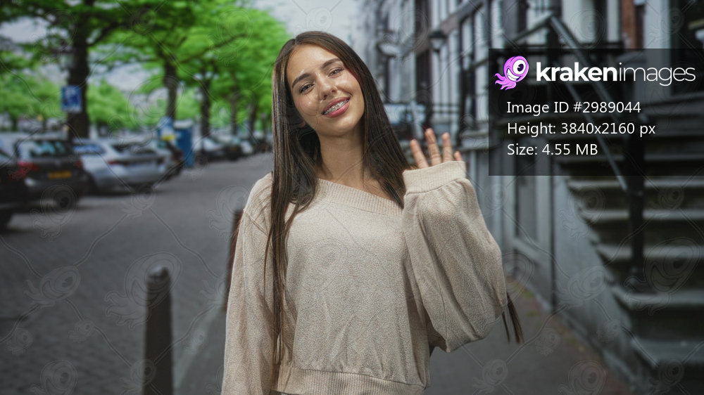 Teenage girl smiling with braces waving hand on a street lined with parked cars and stoops; friendly joy.