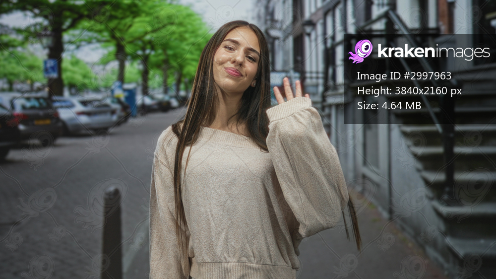 Teenage girl smiling with braces waving hand on a street lined with parked cars and stoops; friendly joy.