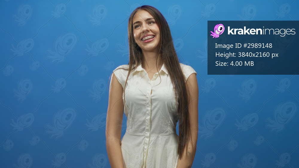 Teenage girl smiling broadly showing teeth with braces, long straight hair, wearing white dress, slight head tilt in studio; youthful joy.