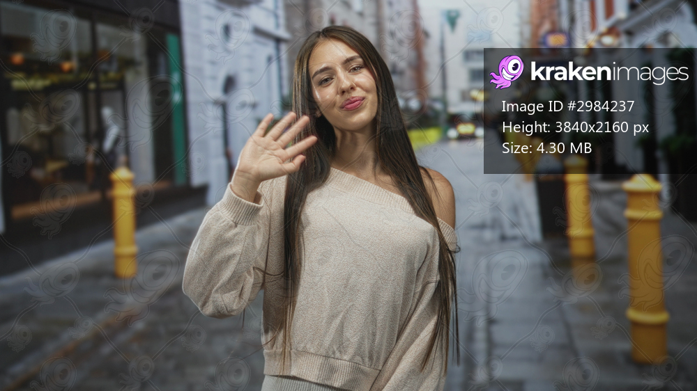 Teenage girl smiling and waves hand on wet city street with yellow bollards and braces visible; friendly joy.