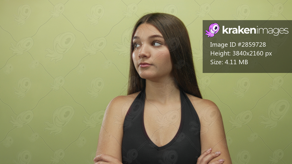 Teenage girl stands with crossed arms showing bare shoulders in studio and meets camera with direct gaze; confidence.