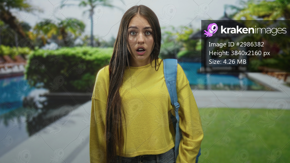 Teenage girl student with blue backpack gasps, mouth open, standing at resort poolside gazebo; surprise uncertainty.