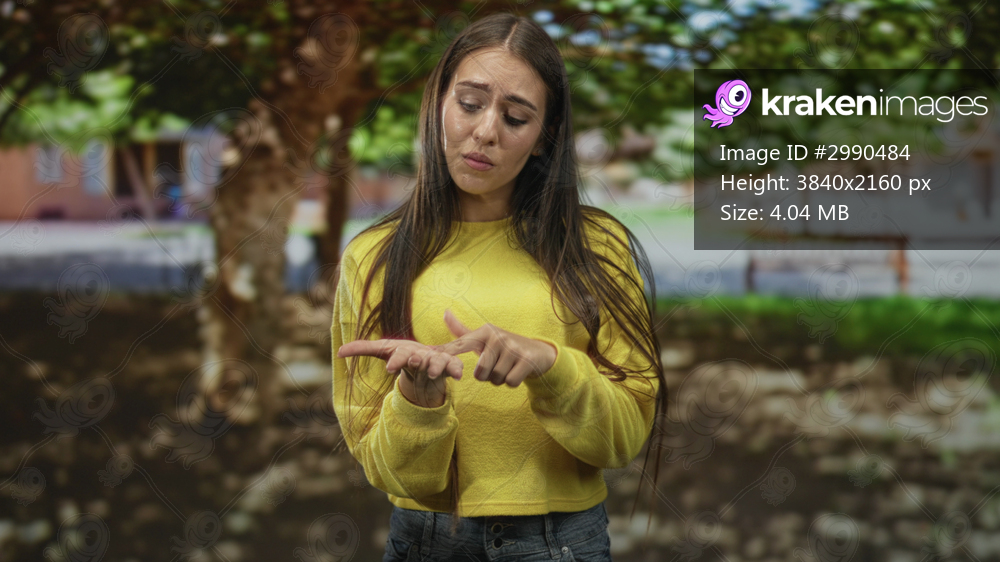 Teenage girl tapping palm with index finger while counting on fingers in park, wearing yellow sweater and braces; uncertainty explanation.
