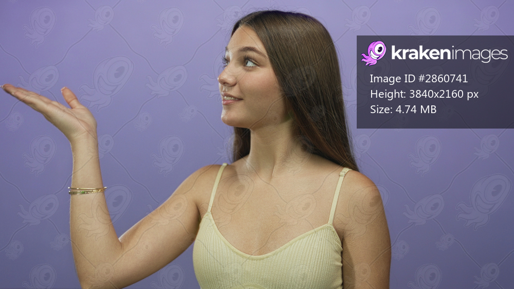 Teenage girl waves bare hand in a purple studio setting while making direct eye contact with camera; friendly greeting.