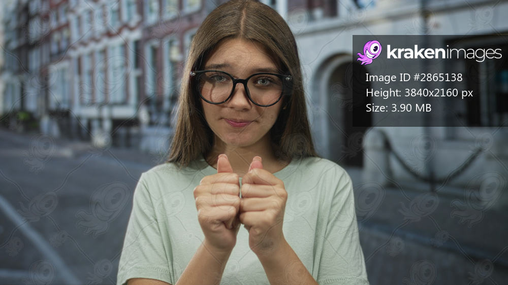 Teenage girl wearing glasses and a light green shirt gives thumbs up with both hands on city street; approval.