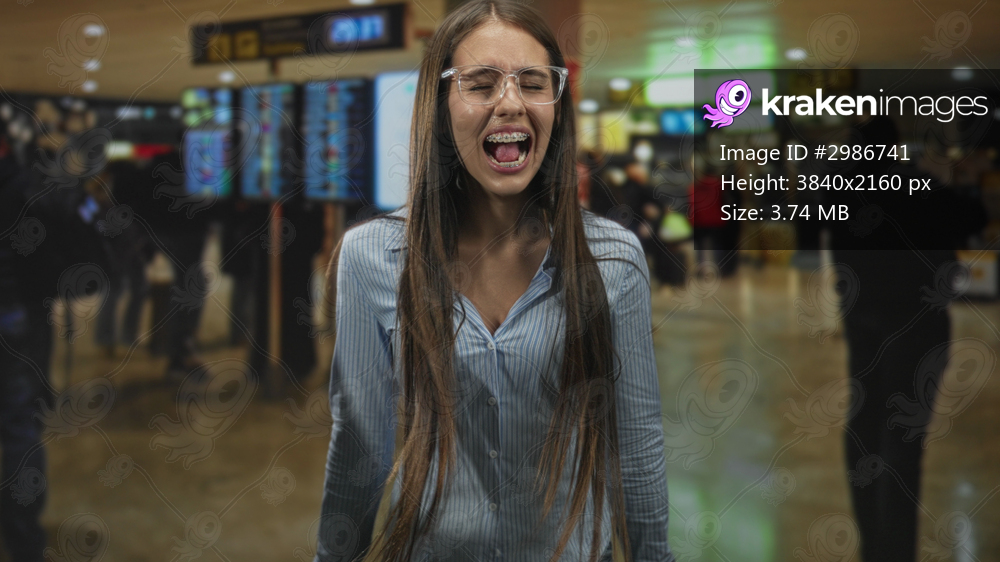Teenage girl wearing glasses and braces screaming with mouth open at airport near flight information displays and travelers; frustration.