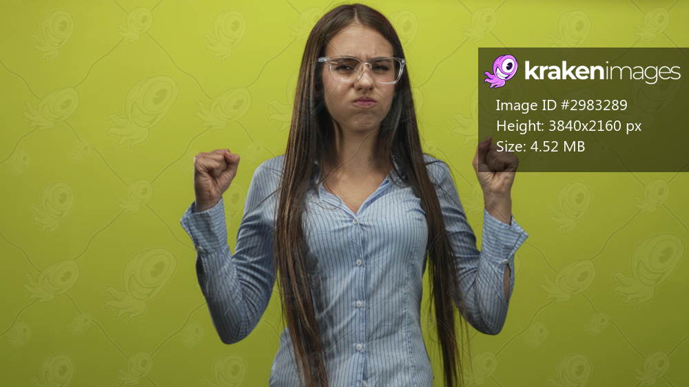 Teenage girl wearing glasses clenches fists and puffs cheeks while extending one arm in a studio; frustration defiance.