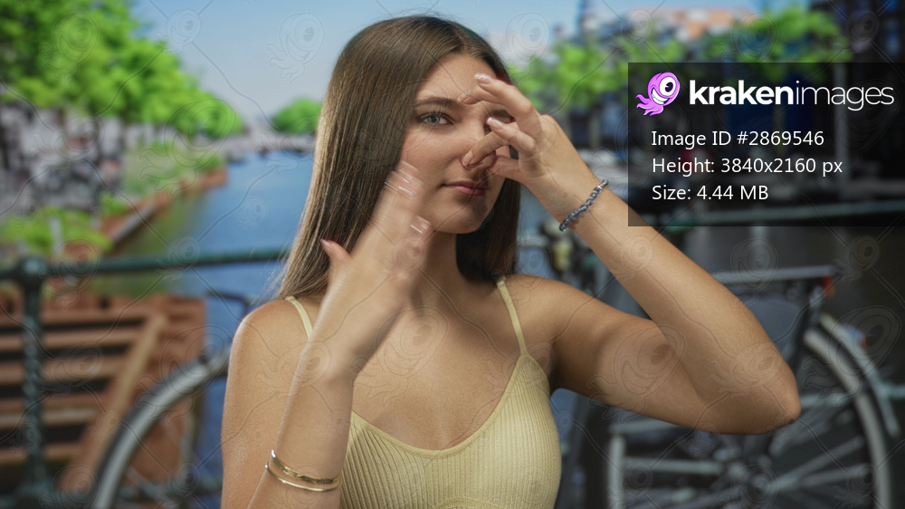 Teenage girl wearing tank top pinches nose beside bicycle on scenic canal bridge in amsterdam; disgust.