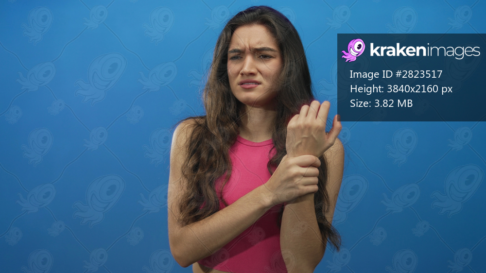 Teenage hispanic woman holds wrist with furrowed brow showing pain gesture in blue studio; distress.