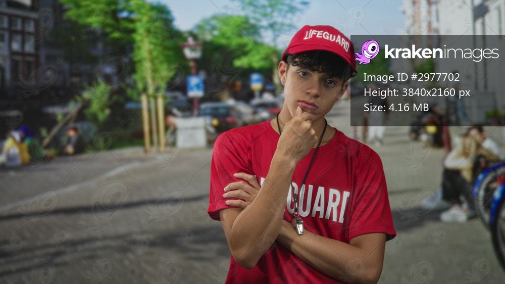 Teenage lifeguard man in red shirt and cap with visible whistle, hand on chin thinking gesture on an urban street; contemplative duty.