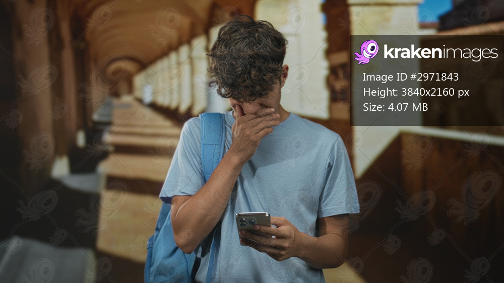 Teenage man with blue backpack holding and tapping a smartphone, smiling and sometimes covering his mouth while standing in a stone arch building; amusement distraction. - Kraken Images