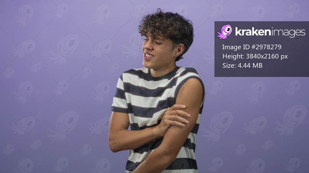 Teenage man clutching his left arm, rubbing his forearm with a pained expression while standing against a purple seamless studio backdrop; discomfort vulnerability. - Kraken Images
