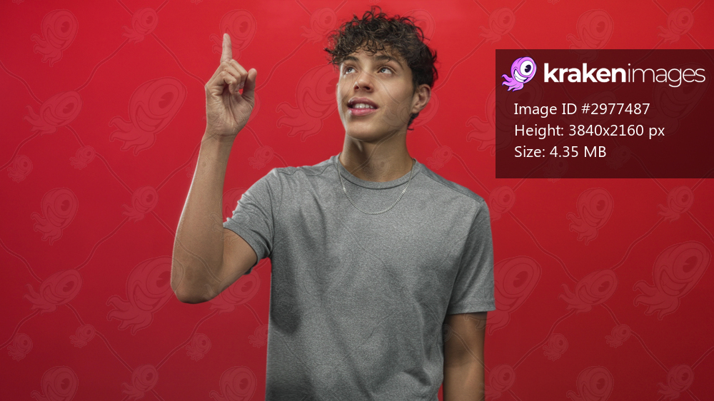 Teenage man with curly hair and chain necklace points finger up in red studio while smiling and looking upward;optimism inspiration.