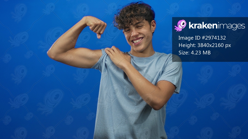 Teenage man flexes bicep and pulls sleeve to show muscle in studio, wearing blue tshirt and smiling; confidence youth energy.