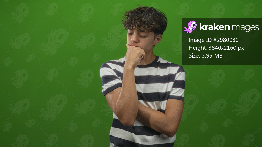 Teenage man with hand to mouth and folded arm against green studio backdrop, wearing striped shirt, looking down, pensive expression; thoughtful introspection. - Kraken Images