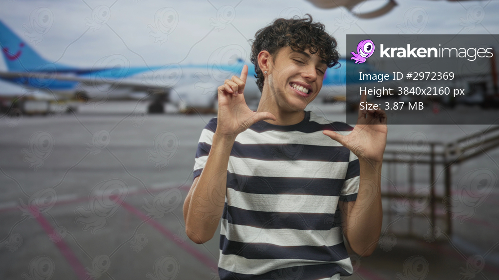 Teenage man making a finger frame with hands and smiling with tongue out at airport tarmac near parked jet and luggage cart; playful travel excitement. - Kraken Images
