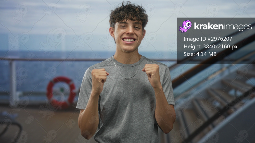Teenage man on ship deck smiling with raised fists and pointing finger, wearing gray tee and necklace beside lifebuoy and metal stairs; joy celebration. - Kraken Images