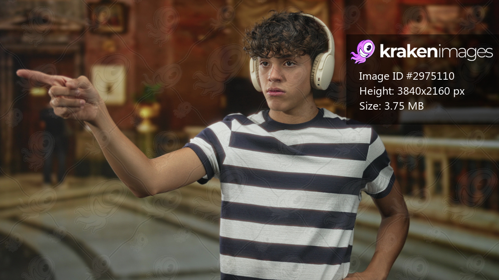 Teenage man pointing finger toward unseen object inside ornate church building, wearing headphones and striped shirt; focus determination.