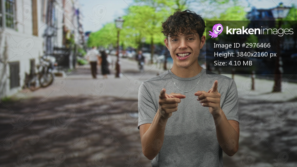 Teenage man pointing fingers with bare hands toward camera, smiling and gesturing in a sunny street by a canal with bicycles and lamp posts; playful confidence. - Kraken Images