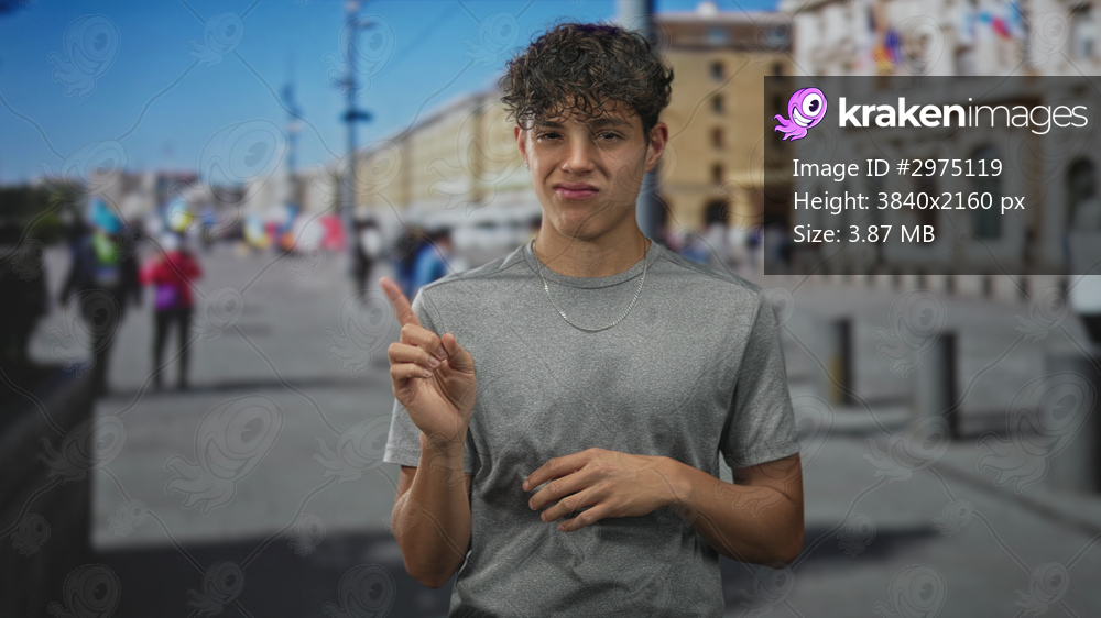 Teenage man pointing index finger while wearing a chain necklace in street; skepticism youth attitude.