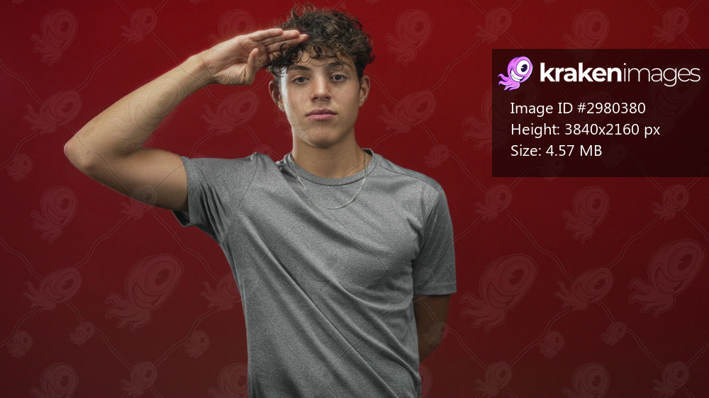 Teenage man salutes with bare forearm and hand to forehead holding neutral expression in studio; pride respect.