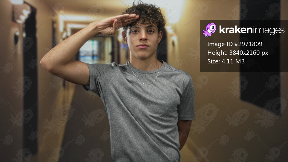 Teenage man salutes with right hand revealing forearm and chain necklace in dim hotel building corridor; respectful.